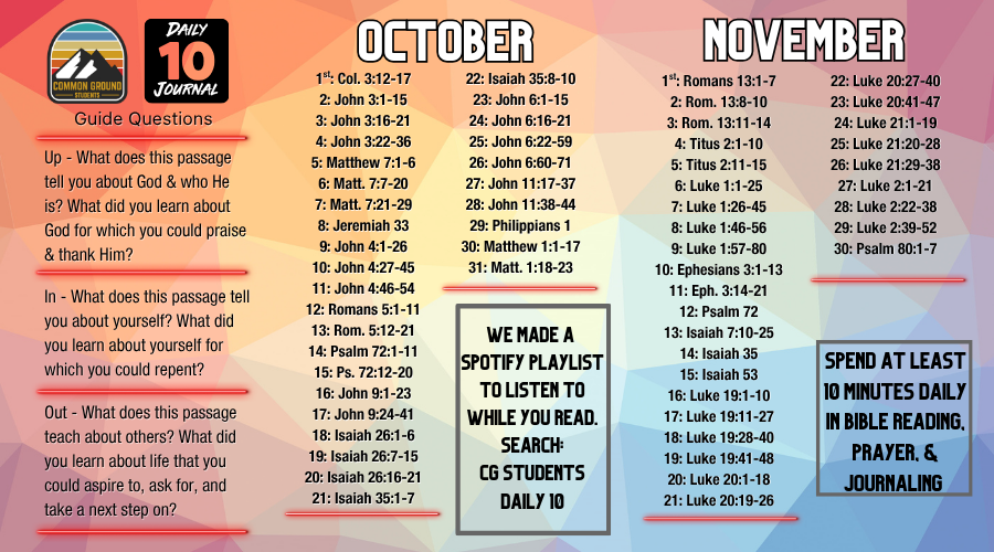 Daily 10 is a reading schedule with helpful questions to assist everyone at CG Students in reading the Bible and praying to God for at least 10 minutes a day.